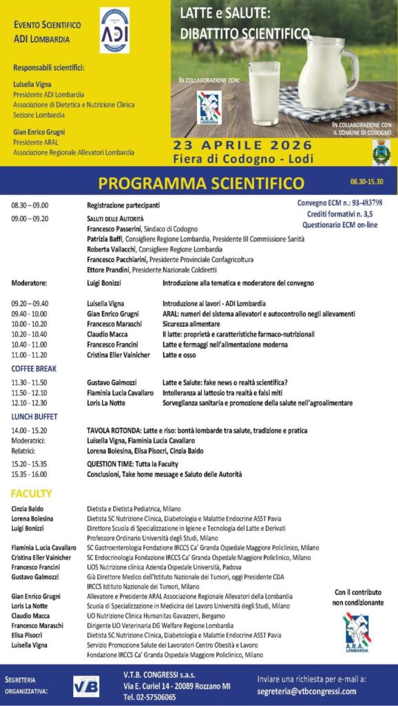 Responsabili scientifici dell’evento sono Luisella Vigna, presidente ADI Lombardia (Associazione Italiana di Dietetica e Nutrizione Clinica – Sezione Lombardia), e Gian Enrico Grugni, presidente ARAL (Associazione Regionale Allevatori Lombardia).